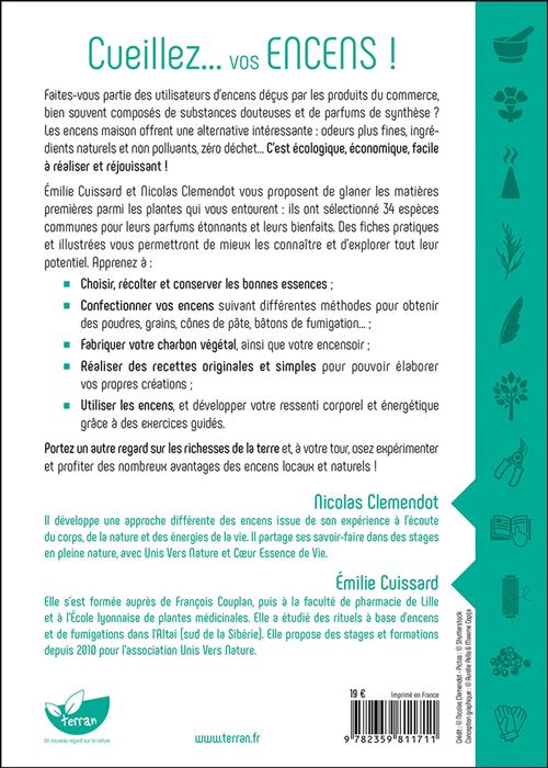 Faites-vous partie des utilisateurs d’encens déçus par les produits du commerce, bien souvent composés de substances douteuses et de parfums de synthèse ? Les encens maison offrent une alternative intéressante : odeurs plus fines, ingrédients naturels et non polluants, zéro déchet… C’est écologique, économique, facile à réaliser et réjouissant ! Émilie Cuissard et Nicolas Clemendot vous proposent de glaner les matières premières parmi les plantes qui vous entourent : ils ont sélectionné 34 espèces communes pour leurs parfums étonnants et leurs bienfaits. Des fiches pratiques et illustrées vous permettront de mieux les connaître et d’explorer tout leur potentiel. Apprenez à : choisir, récolter et conserver les bonnes essences ; confectionner vos encens suivant différentes méthodes pour obtenir des poudres, grains, cônes de pâte, bâtons de fumigation… ; fabriquer votre charbon végétal, ainsi que votre encensoir ; réaliser des recettes originales et simples pour pouvoir élaborer vos propres créations ; utiliser les encens, et développer votre ressenti corporel et énergétique grâce à des exercices guidés. Portez un autre regard sur les richesses de la terre et, à votre tour, osez expérimenter et profiter des nombreux avantages des encens locaux et naturels !