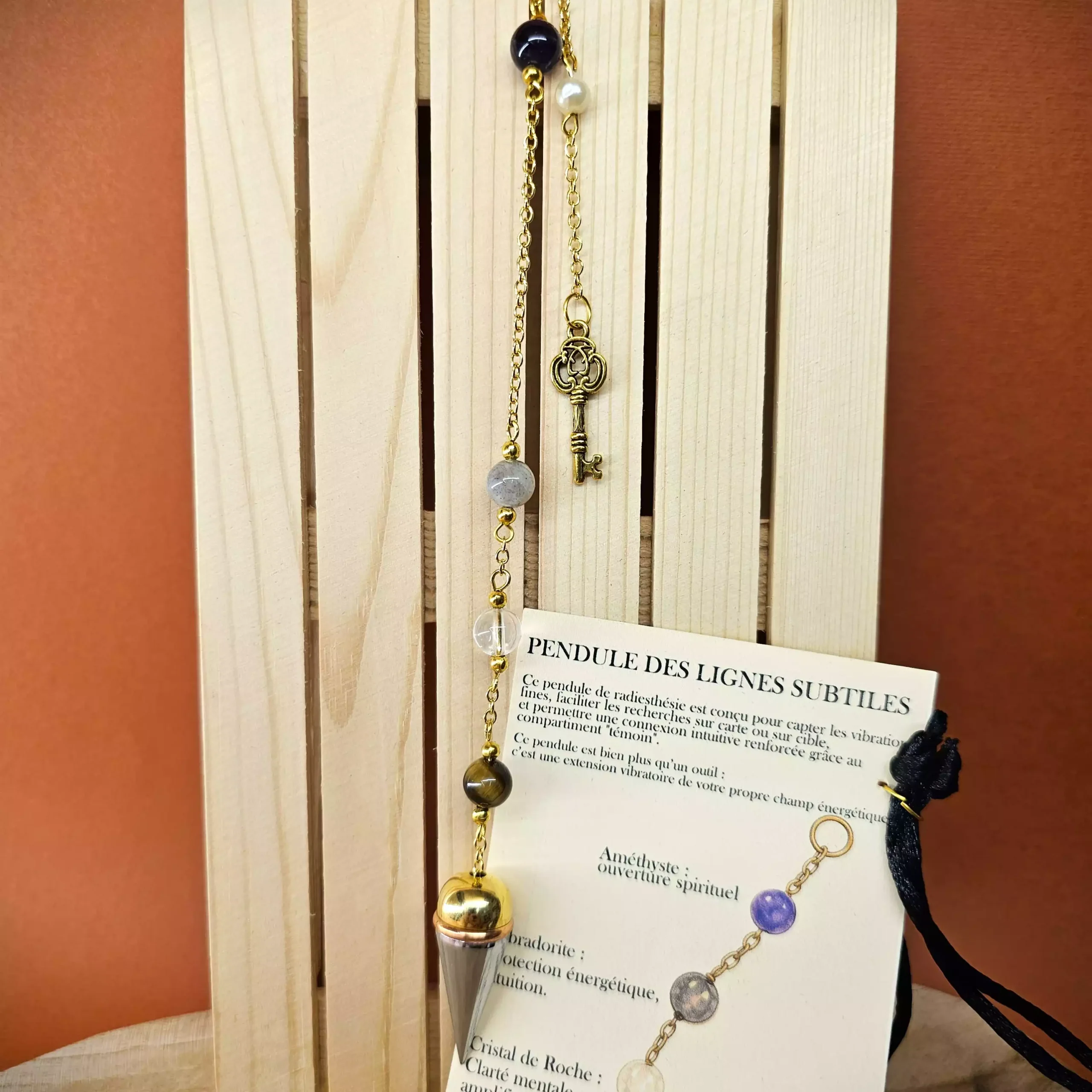 Améthyste, Labradorite, Cristal de Roche et Œil de Tigre réunis pour un pendule intuitif, protecteur et unique.