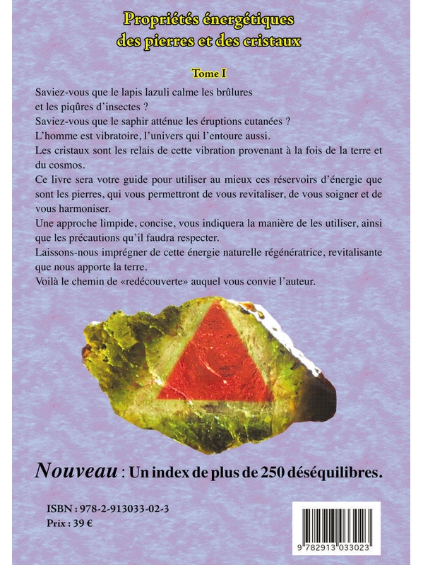 L'homme est vibratoire. Le monde qui l'entoure aussi. Les pierres et les cristaux sont les relais énergétiques de cette vibration, vers l'homme pour l'homme. Utiliser les propriétés énergétiques et thérapeutiques des cristaux, c'est se relier aux énergies de la Terre. Ce livre sera votre guide pour y parvenir. 7ème édition augmentée - 400 pierres au 86ème mille. Nouveau : Un index de plus de 250 équilibres. Plus de 1000 photos couleur.