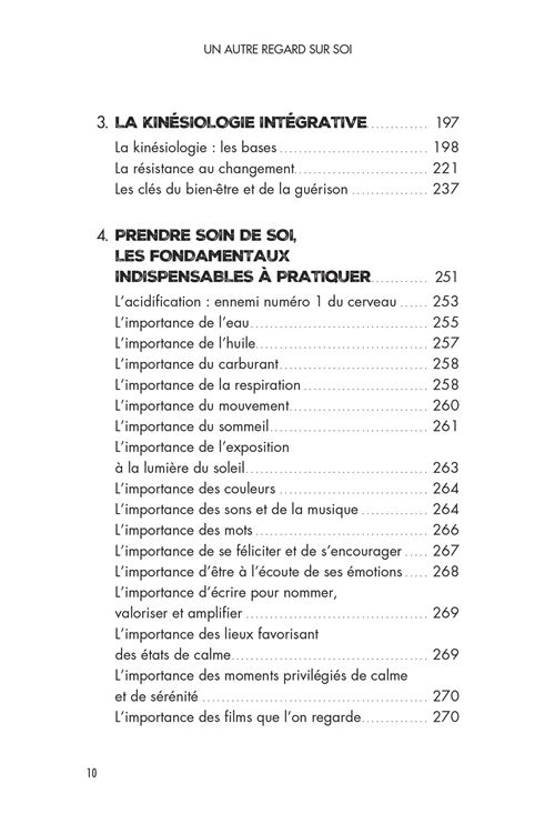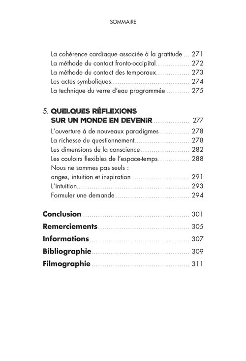 • Les techniques très simples pour optimiser notre relation tête-cœur-corps : la méthode fronto-occipitale, les actes symboliques et psychomagiques, l'importance de l'eau, de la respiration et du mouvement, la clarification des intentions,...